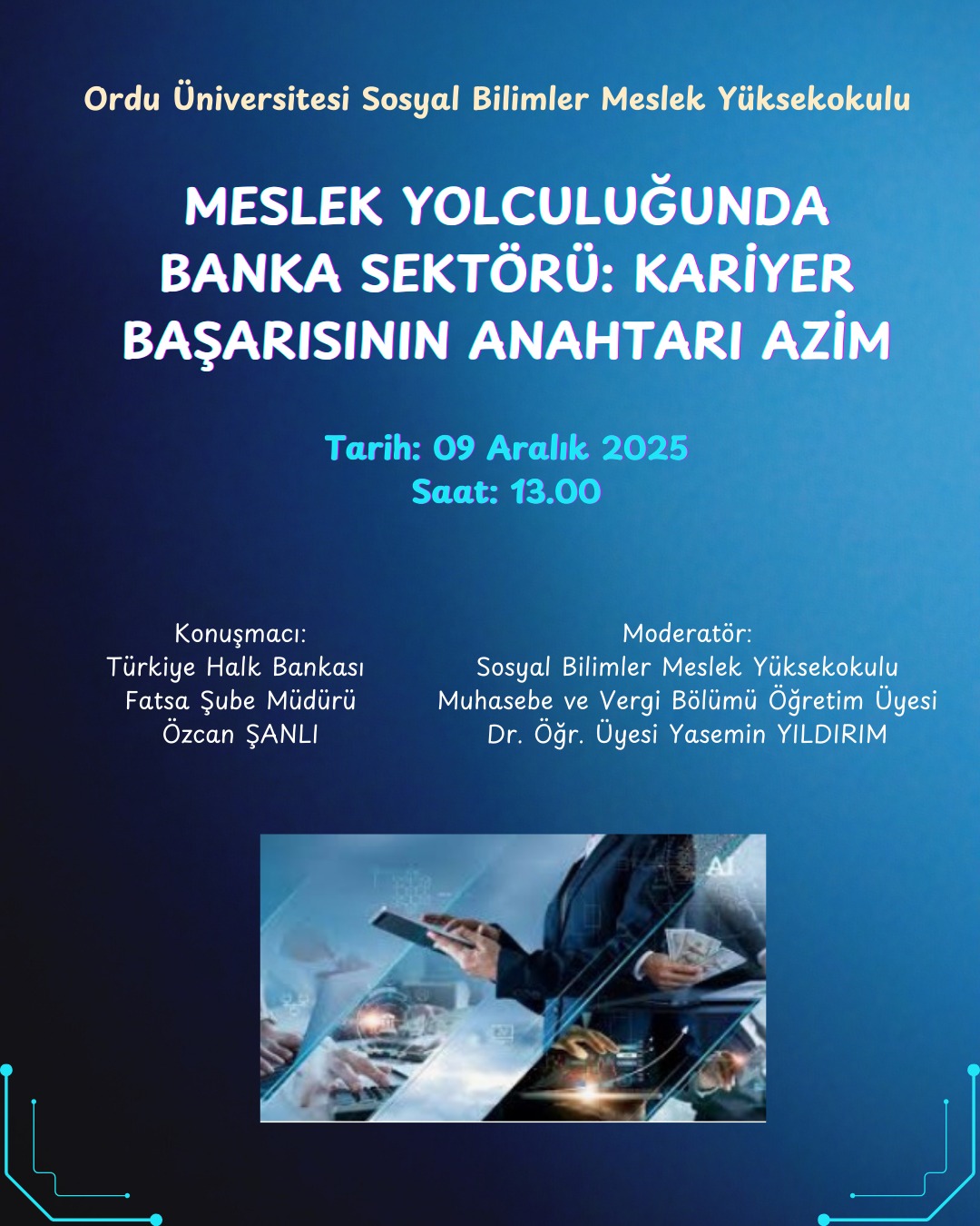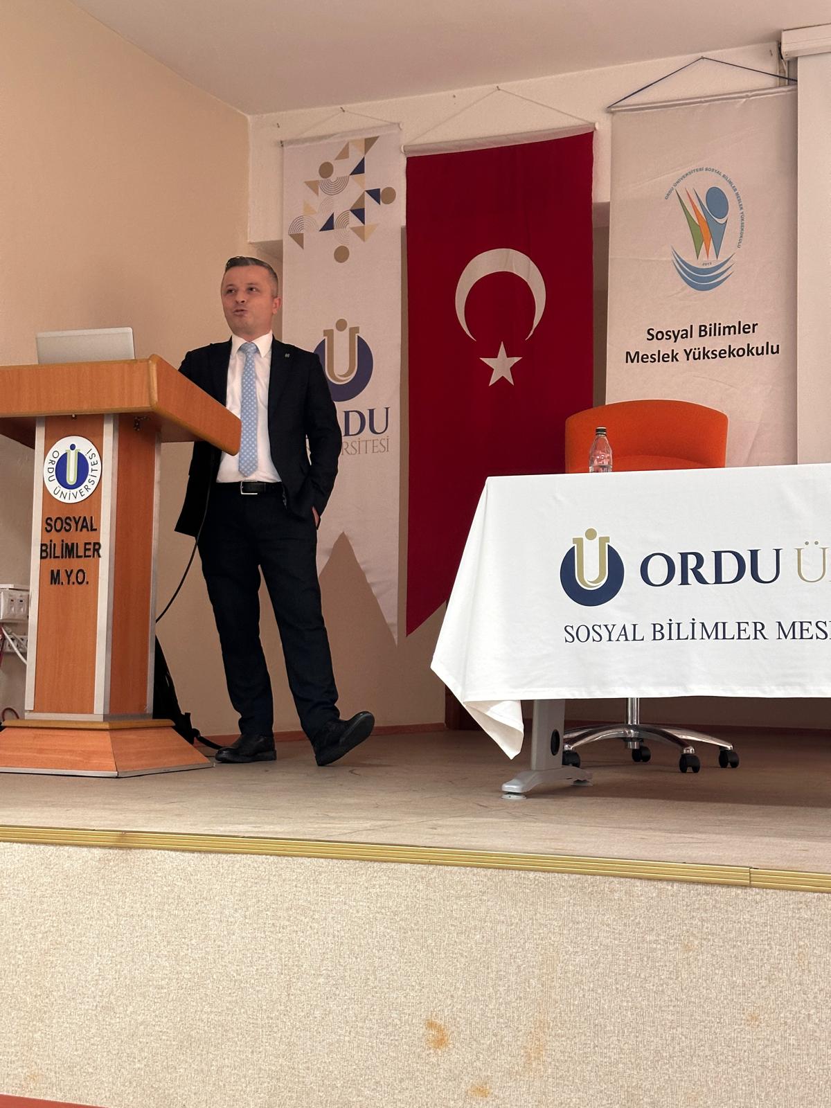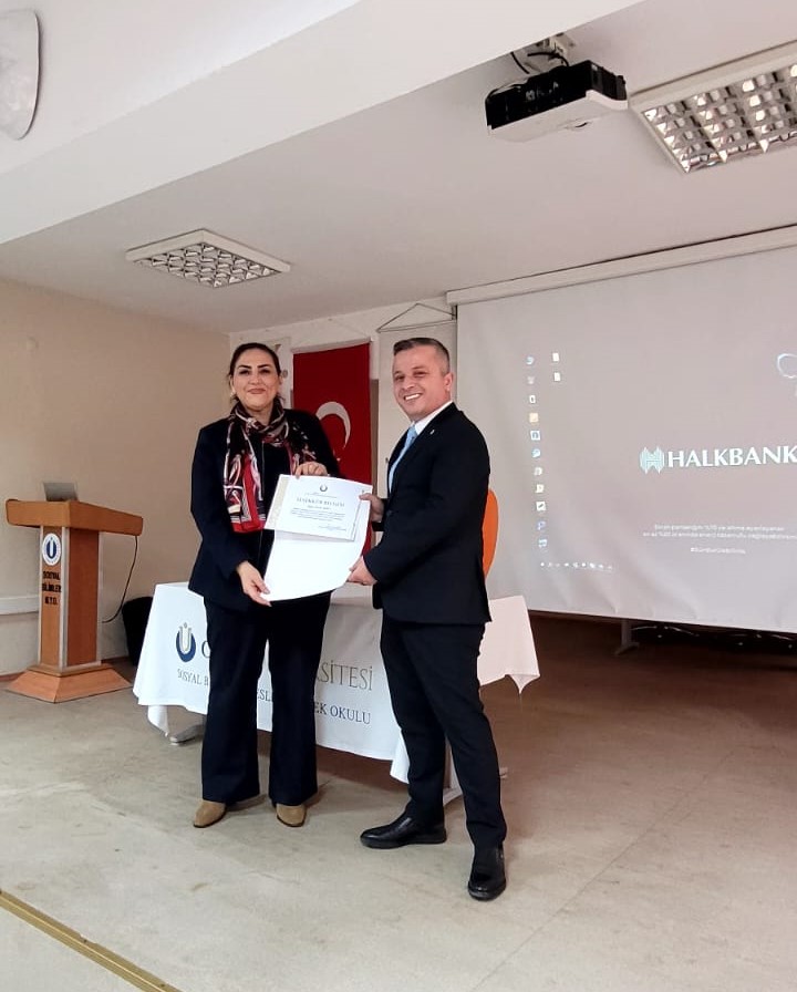 Meslek Yüksekokulumuz Muhasebe ve Vergi Bölümü Muhasebe ve Vergi Uygulamaları Programı tarafından “Meslek Yolculuğunda Banka Sektörü: Kariyer Başarısının Anahtarı Azim” konulu söyleşi programı düzenlendi. Muhasebe ve Vergi Bölümü Başkanı Dr. Öğr. Üyesi Yasemin Yıldırım’ın moderatörlüğünü yaptığı etkinlikte Halkbank Fatsa Şubesi Müdürü Özcan Şanlı konuşmacı olarak yer aldı. Banka personelleri, öğretim elemanları ve öğrencilerin katılımıyla gerçekleştirilen etkinlikte Şanlı bankacılık sektöründe çalışmanın gerektirdiği niteliklerden, çalışma hayatına atılmak için hayatta birçok fedakârlıkların yapılması gerekliliğinden, kendi hayatının kariyer basamaklarından ve Muhasebe ve Vergi bölümünden mezun olan öğrencilerin sektörde sahip olduğu avantajlardan bahsetti. Etkinlik Yüksekokul Müdürü Prof. Dr. Cemile Bahtiyar Karadeniz’in Şanlı’ya teşekkür belgesini takdim etmesiyle son bulmuştur.