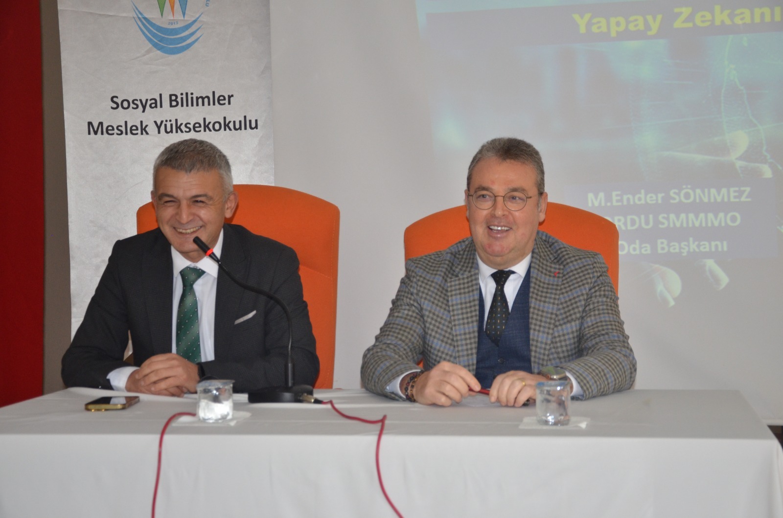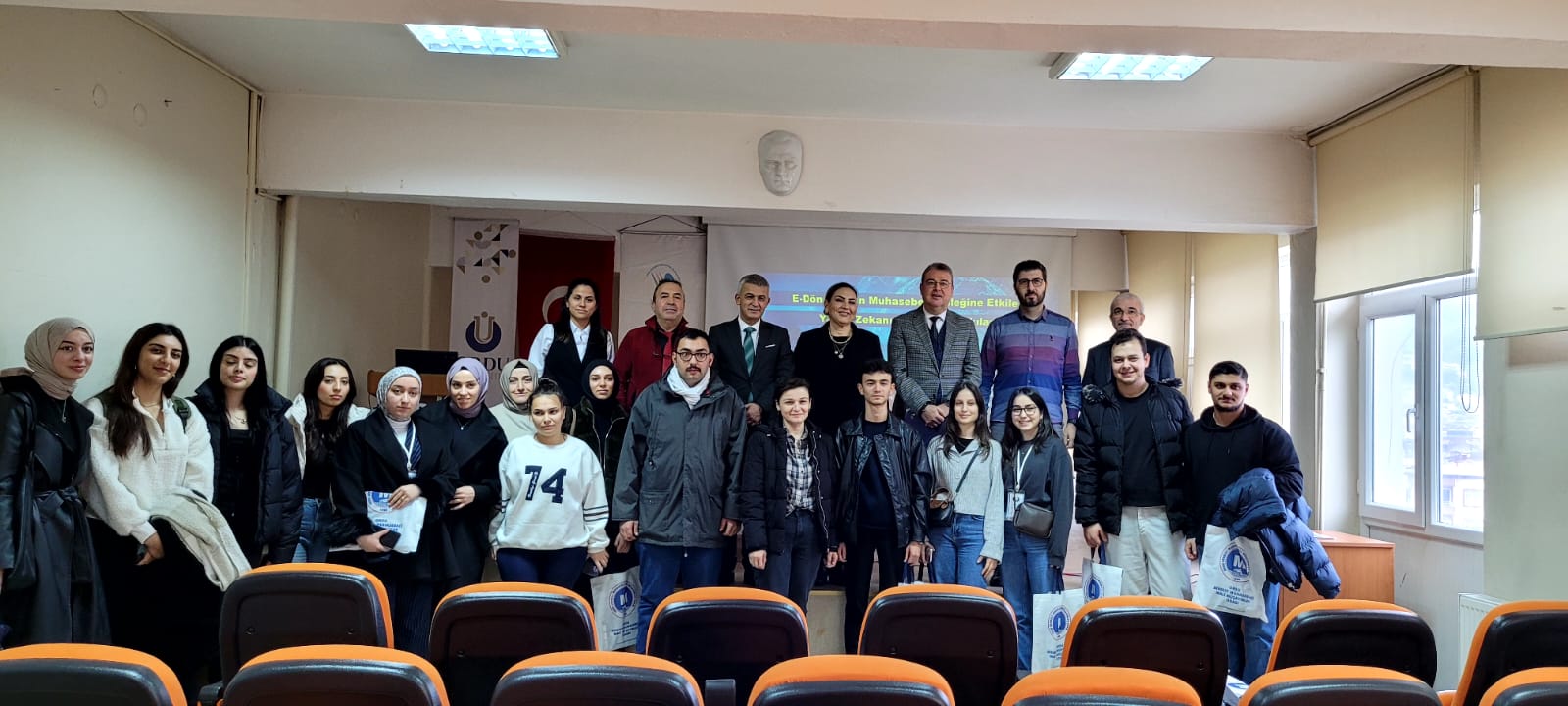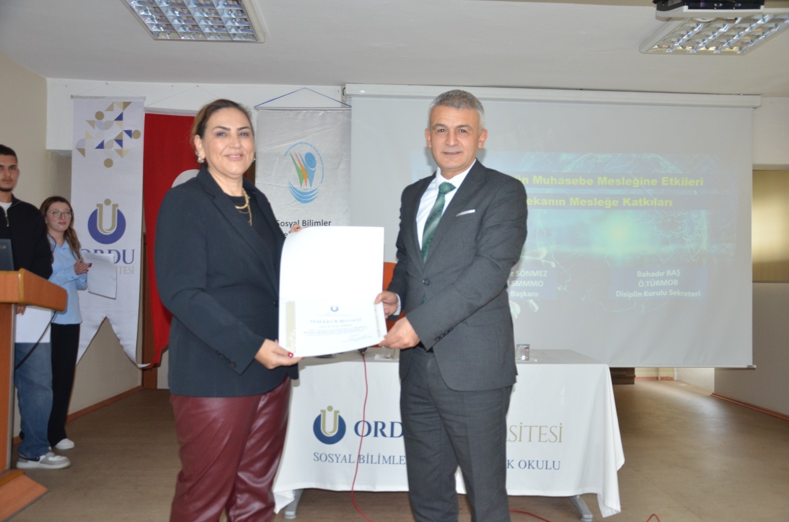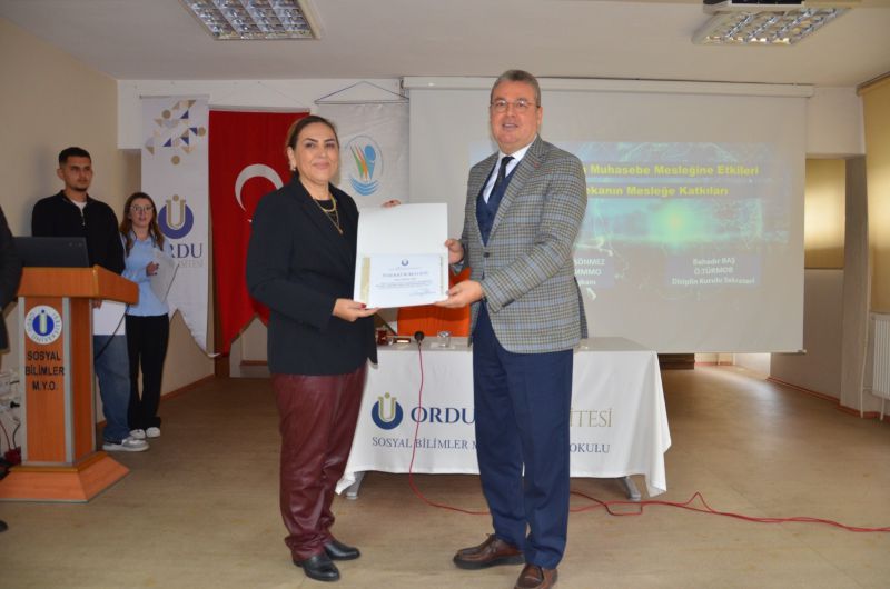 Meslek Yüksekokulumuzda öğrenci-sektör buluşmaları kapsamında Muhasebe ve Vergi Bölümü tarafından “E-Dönüşümün Muhasebe Mesleğine Etkileri, Yapay Zekânın Mesleğe Katkıları” konulu söyleşi programı düzenlendi. Ordu SMMMO Başkanı M. Ender Sönmez ile Ö. TÜRMOB Disiplin Kurulu Sekreteri Bahadır Baş’ın konuşmacı olarak yer aldığı etkinlikte; e-dönüşümün mesleğe etkileri, yapay zekânın sunduğu fırsatlar, dijitalleşme sürecinde karşılaşılan zorluklar ve gençlerin bu dönüşümde nasıl bir rol üstlenebileceği konuları ele alındı. Sönmez, 2018 yılından itibaren muhasebe belgelerinin ağırlıklı olarak elektronik ortamda düzenlendiğini ve kayıt tutmayı kolaylaştırıcı sistemlerin uygulandığını ifade etmiştir. Raporların işlenişinde yapay zekânın önemli ölçüde yer tuttuğundan bahsetmiş ancak her zaman düşünsel becerinin gerektirdiği işleri yapmak için insanların bu sektörde yer alması gerektiğini ifade etmiştir. Baş ise, ülkede her sektörde olduğu gibi muhasebe alanında da topluca bir değişimin yaşandığını ve bu değişime ayak uyduramayanların faaliyetlerinin son bulduğunu belirtmiştir. Tecrübe sahibi ara elemanların muhasebe bürolarının ayrılmaz parçası olduğunu belirterek, bu elemanların sektördeki önemine dikkat çekmiştir. Hem üniversite eğitimi sırasında hem de mezun olduktan sonra her fırsatta öğrencilerin kendilerini sektör içindeki uygulamalara dâhil etmeleri gerektiğini ifade etmiştir. Etkinlik öğrencilerin soruları, Ordu SMMM Odasının öğrencilere hediyelerini vermeleri ve Yüksekokul Müdürü Prof. Dr. Cemile Bahtiyar Karadeniz’in teşekkür belgelerini takdim etmesiyle son bulmuştur.